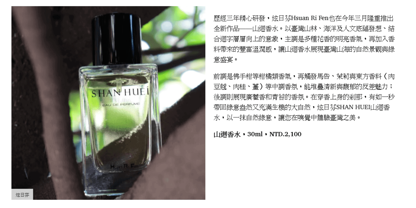 歷經三年精心研發,炫日芬Hsuan Ri Fen也在今年三月隆重推出全新作品——山迴香水。以臺灣山林、海洋及人文底蘊發想、結合迴字層層向上的意象,主調是多種花香的明亮香氣,再加入香料帶來的豐富溫潤感,讓山迴香水展現臺灣山海的自然景觀與綠意盛宴。