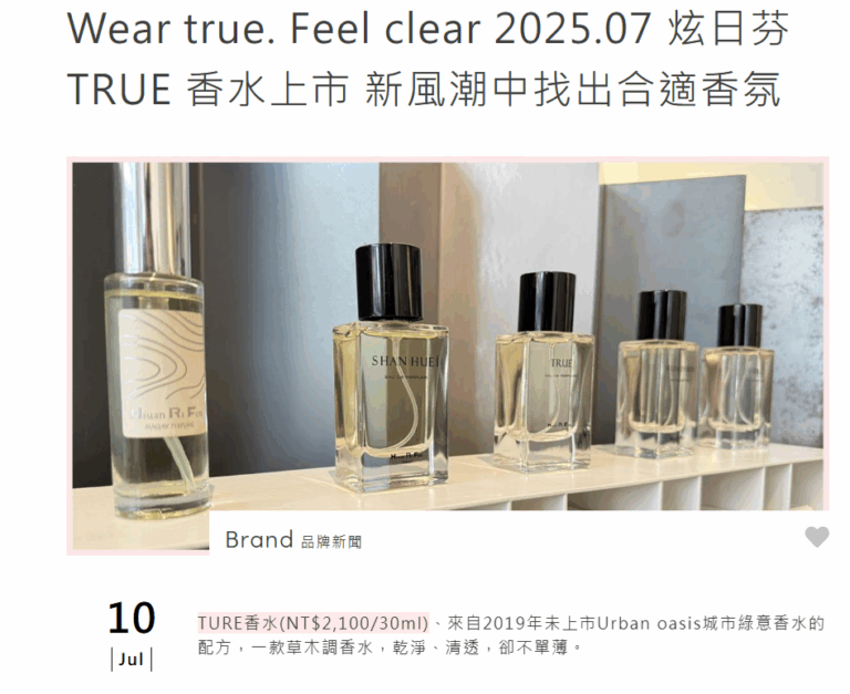 文章來源:Wear true. Feel clear 2025.07 炫日芬TRUE 香水上市 新風潮中找出合適香氛