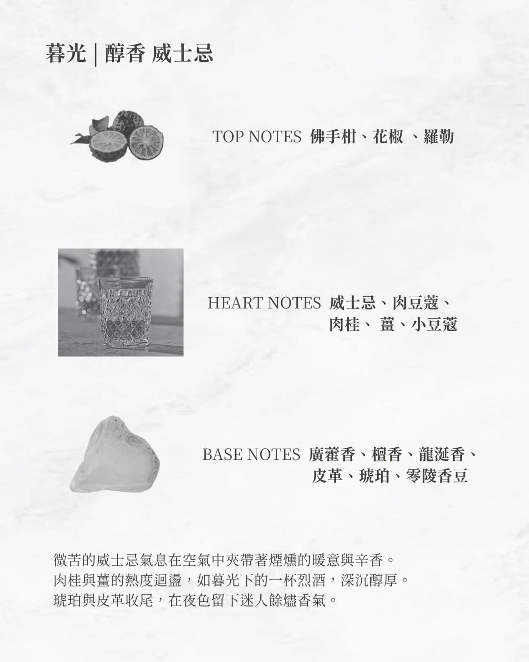 前調如同潔白襯衫的領口,挺拔而清爽;花椒與草本的搭配,如同領帶結,收束清晰銳利的線條。中調宛如西裝外套的暗色質感,威士忌與暖香料交織,散發溫厚卻帶有張力的層次。後調是翻領下隱約餘韻——檀香、皮革與琥珀,勾勒出立體的線條與沉穩的份量感。