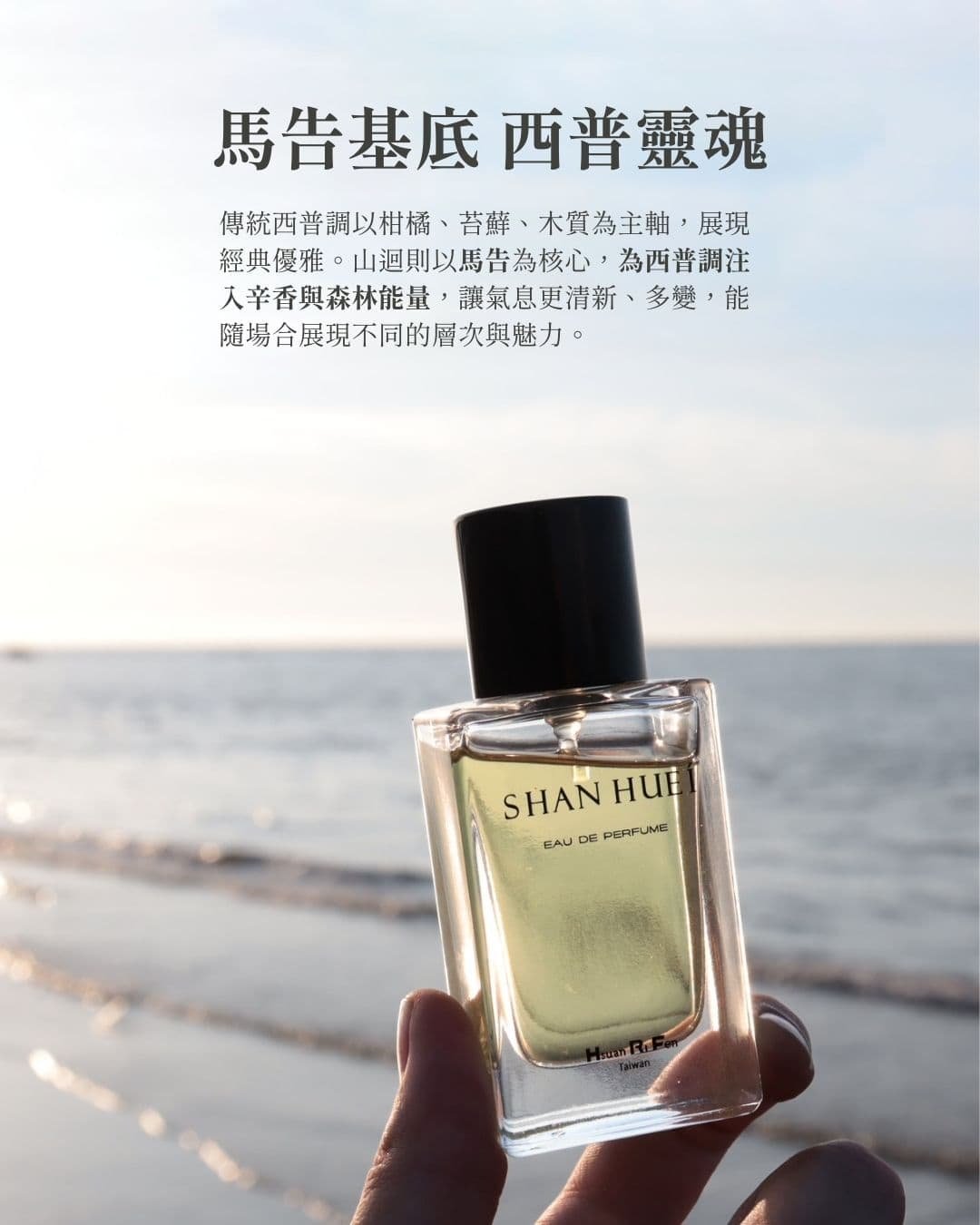 SHAN HUEI 山迴香水,以馬告為核心,交織果香、辛香與西普木質,描繪山海氣味風景。香氣層層遞進,如山路蜿蜒向上,展開一段有深度的嗅覺旅行。清新與厚實並存,山迴為經典西普調注入森林能量,展現自然、文化與現代工藝的平衡。